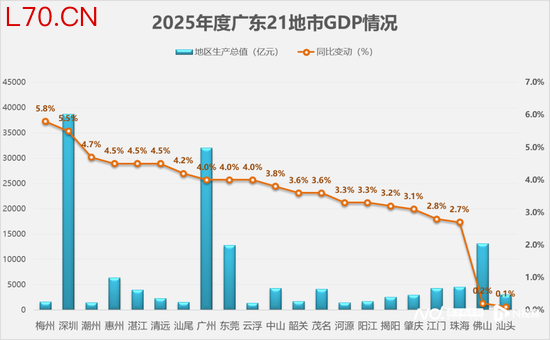 2025年,佛山GDP为13157.35亿元,同比增长0.2%。从广东省内看,2025年全省四个万亿城市中,深圳增速高于全国,广州、东莞顶住压力实现高于全省的增速,唯有佛山增速远低于全省、在广东21个地市中仅略高于汕头。
