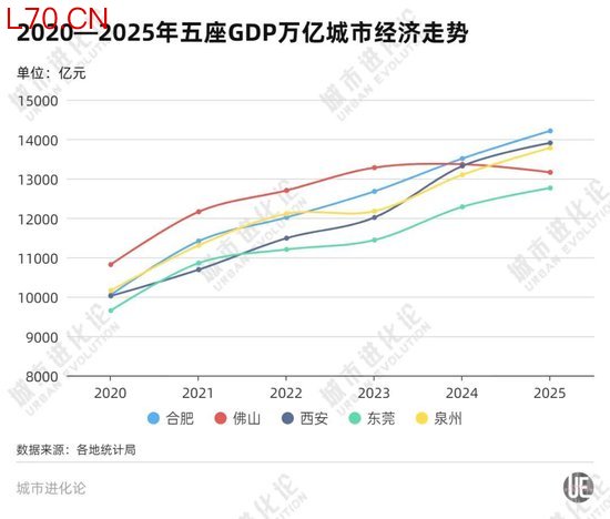 数据显示,“十三五”末,佛山GDP体量高于合肥、西安等中西部省会,以及泉州、东莞等东部强市。但到“十四五”末,佛山已被合肥、西安、泉州先后赶超,东莞更是步步紧逼、贴身缠斗。