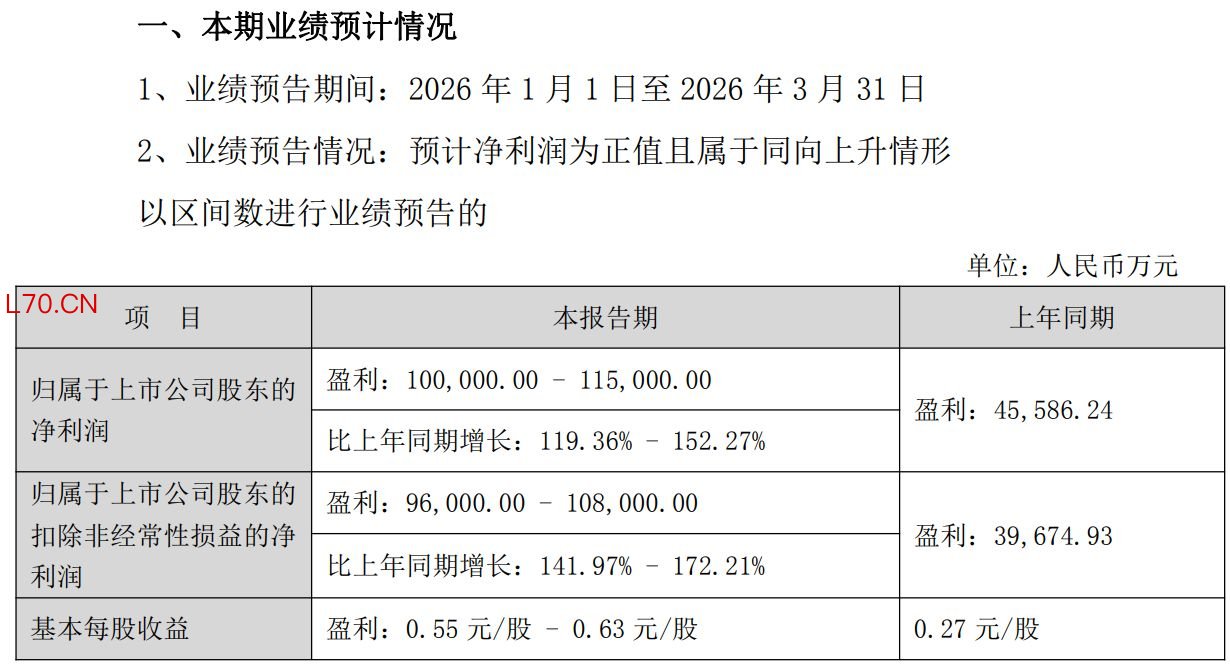 公告显示,预计2026年第一季度公司实现归母净利润为10亿元至11.5亿元,同比增长119.36%至152.27%;扣非归母净利润9.6亿元至10.8亿元,同比增长141.97%至172.21%;基本每股收益0.55元/股至0.63元/股。