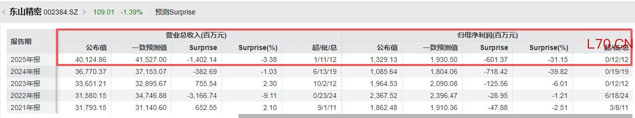 《每日经济新闻》记者(以下简称“每经记者”)注意到,虽然东山精密2025年营收和归母净利润同比实现双增长,但仍不及机构的预期值。