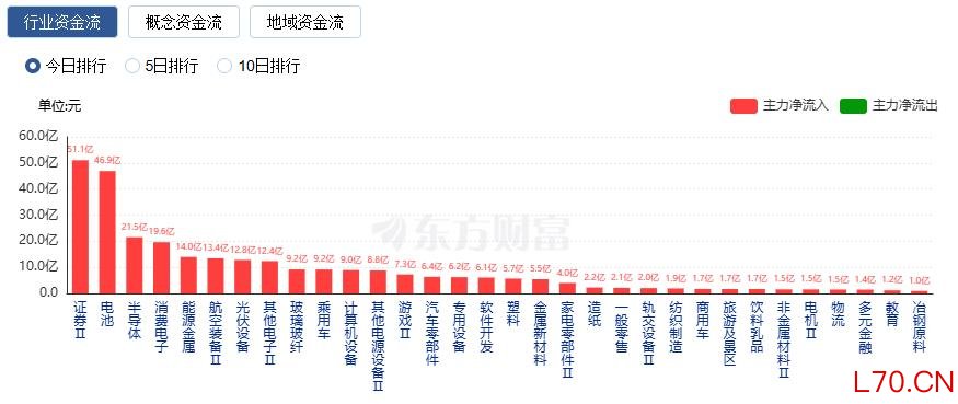 行业资金方面,截至收盘,证券、电池、半导体等净流入排名靠前,其中证券净流入51.05亿。