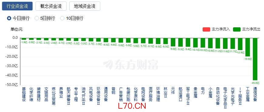 净流出方面,通信设备、工业金属、IT服务等净流出排名靠前,其中通信设备净流出44.98亿元。