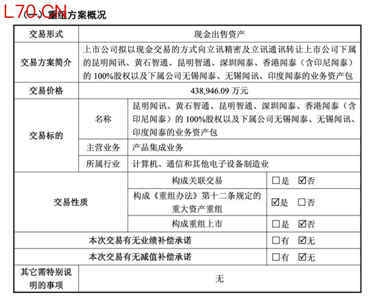 据闻泰科技2025年5月16日发布的《重大资产出售报告书(草案)》披露,本次交易金额为43.89亿元。本次交易标的资产的各项交割工作正在推进过程中,其中昆明智通、深圳闻泰、黄石智通、昆明闻讯股权以及无锡闻泰、无锡闻讯相关业务资产包均已完成交割,印度闻泰相关业务资产包资产也已完成转移。