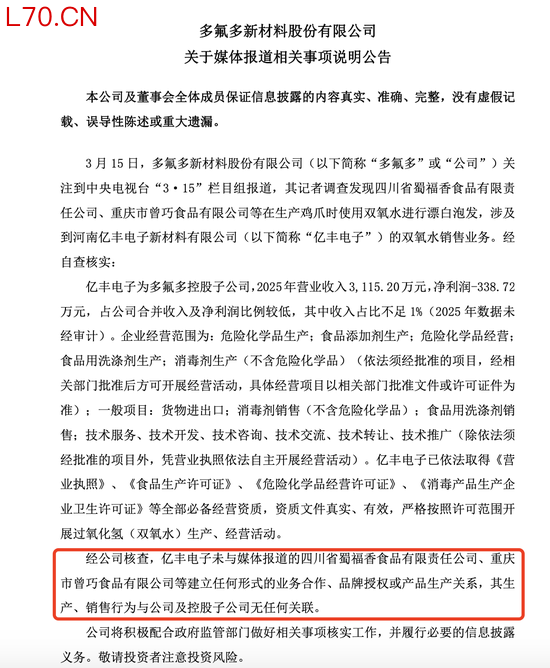 针对控股子公司被央视3·15晚会曝光涉及食品安全问题,多氟多(002407)于3月16日早间发布公告称,经公司核查,河南亿丰电子新材料有限公司(简称“亿丰电子”)未与媒体报道的四川省蜀福香食品有限责任公司、重庆市曾巧食品有限公司等,建立任何形式的业务合作、品牌授权或产品生产关系,其生产、销售行为与公司及控股子公司无任何关联。