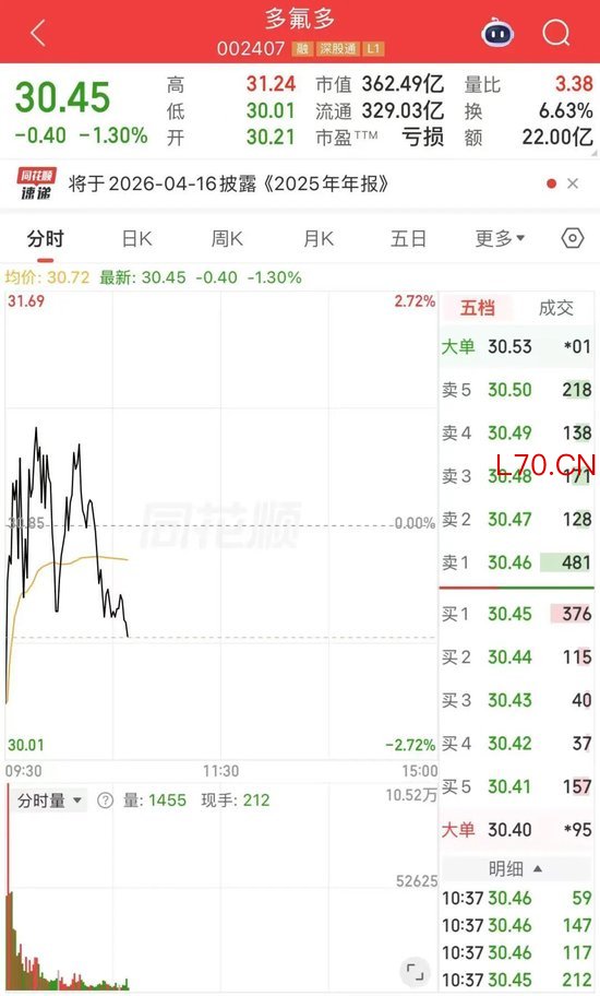 截至发稿,多氟多跌超1%证券配资内容,报30.45元/股。