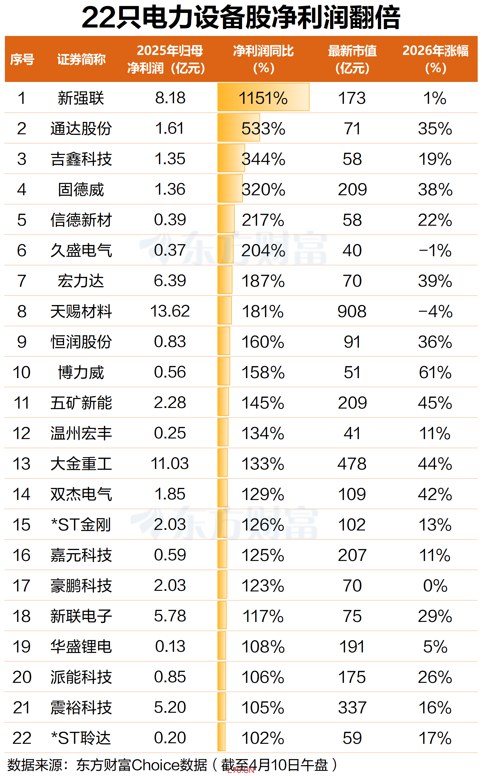 A股方面,在近年来的高速发展下,电力设备板块业绩飙涨。东方财富Choice数据显示,截至4月10日午盘,中证电力设备行业367只成分股中,已有167家公布了2025年业绩,其中40只归母净利润同比增速超50%,22只超100%。新强联增速最快,2025年归母净利润增超11倍;其次是通达股份,增超5倍;吉鑫科技、固德威也均增超3倍。