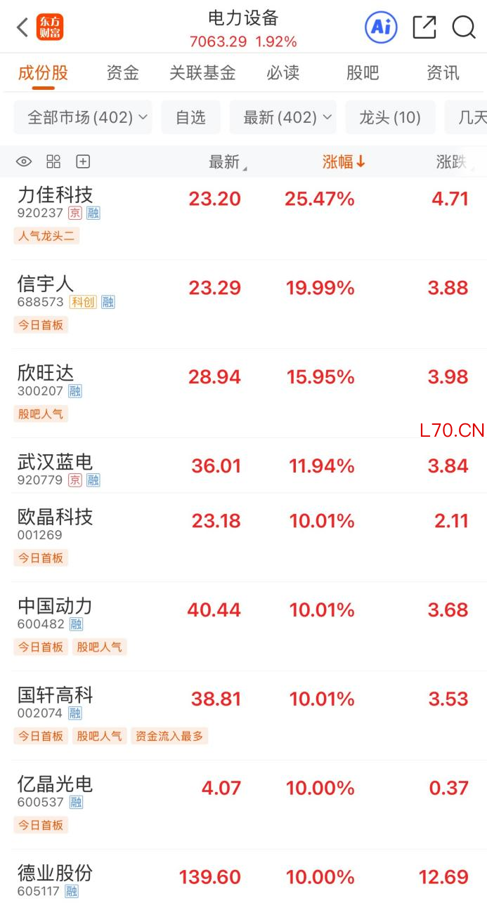 4月10日早盘,电力设备行业高开高走,截至早间收盘,板块上涨1.92%,涨幅居行业板块前列。个股掀起涨停潮,力佳科技暴涨25%,信宇人20CM涨停,欣旺达武汉蓝电涨超10%,欧晶科技、中国动力、国轩高科、亿晶光电、德业股份、中恒电气、福达合金、凯盛新能涨停,南都电源、圣阳股份等涨超9%。